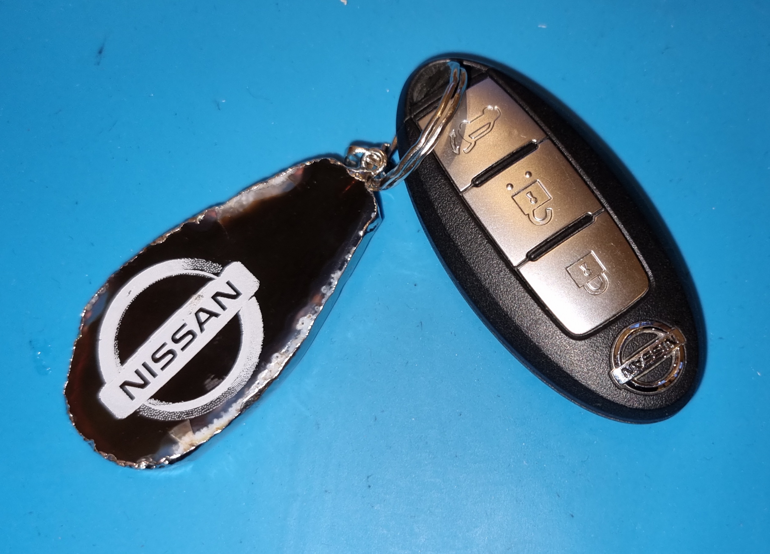 Wie gefällt euch meine neueste Kreation, ein Schlüsselanhänger aus einer braunen Achatscheibe mit Silberrand mit Lasergravur auf beiden Seiten.